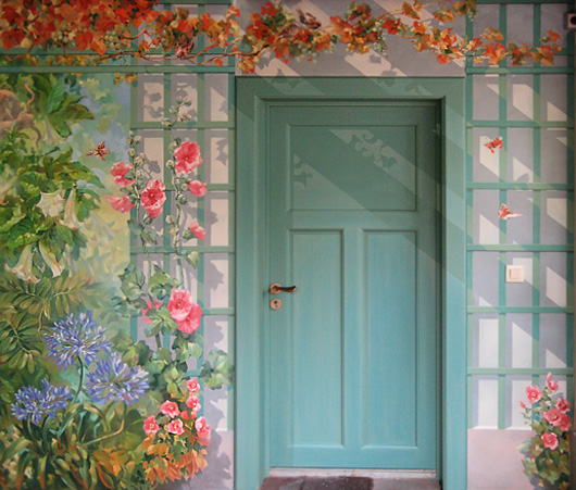 Das Spiel des Sonnenlichts in den Blättern, der Gesang der Vögel in den Bäumen und die Farben der Blumen in das Innere des Hauses zu holen, ist eine Aufgabe der Malerei. Die Darstellung des Lichts, das die feinen Schleier der Luftfeuchte durchdringt, erzeugt die Illusion des Verschmelzens von Innen- und Außenraum. Obwohl nur gemalt, scheinen sich die Blumen im Wind zu wiegen und die Vögel in den Bäumen zu singen. Zur Herstellung dieser natürlichen Effekte ist eine detaillierte Planung unter Berücksichtigung der baulichen Gegebenheiten notwendig.